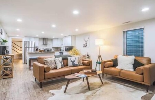 This level is an open concept that has 3 bedrooms and 2 bathrooms and can accommodate up to 7 guests comfortably. There is a master suite with a king bed and a private bathroom. The other bedrooms have a king bed in one and a queen bed in the other. There is also 1 huge sectional couch. It has a large bright modern kitchen and a large dining table that seats up to 8 with 2 additional spots at the island. The living space has a fireplace and a large sectional where everyone can gather. The kitchen has sliding doors that open up to the backyard.