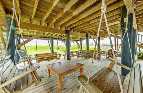 Milky Way is a 4 bedroom camp with 4 bathrooms ( 2 bedrooms have on suite baths with showers, 2 bathrooms contain full tub). This camp is located right next door to a cement beach crossover and also sits next to another vacation rental called Milk Shake. This camp is perfect for family vacations with its open deck and views of the Gulf of Mexico. Downstairs is a covered sitting area that is great for cooking up your vacation meals or just to hang out and relax.