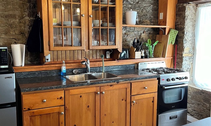 Kitchen has sink, microwave, fridge, gas range with oven, coffee maker, kettle, plus all the fixings for your morning (or evening!) refreshments. Also, plates, cutlery etc, are provided, as well as basic pots & pans for cooking.