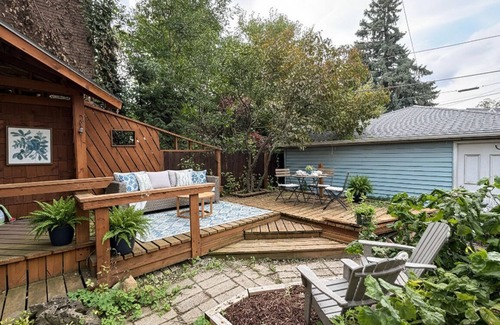 The backyard is a true highlight of this property. Step out onto the grand deck for coffee in the morning or grilling in the evening. Outdoor dining furniture, a fire pit, and sun loungers make this the perfect space to unwind or entertain.