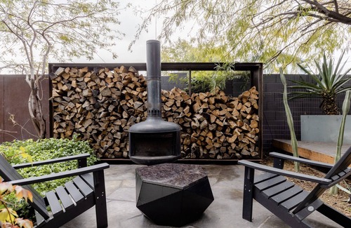 KBOX features a highly tailored interior with central air conditioning, a smart TV, electric glass cooktop, convection microwave oven, disposal, wireless router, bathroom with shower, solid surface countertops, large bay windows, roll shades, cork floors, and a large glass entry pivot door. This apartment has a great, secluded outdoor patio with an outdoor fireplace that has a view to the Phoenix skyline beyond it!