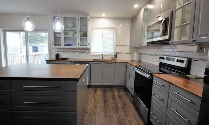 Large bright kitchen with an island; electric ceramic top stove, with an oven, full-size fridge, above-stove microwave. A large table in the eat-in kitchen, with access to a spacious, relatively private backyard with a deck and a natural gas BBQ.