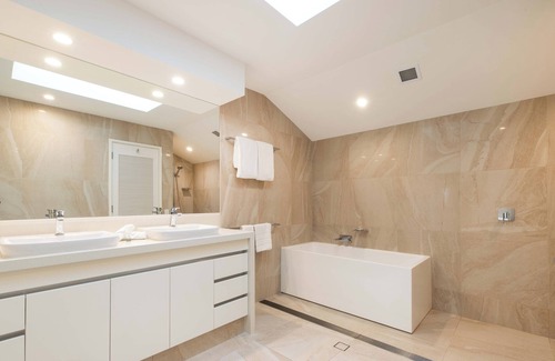 The fully equipped kitchen with extended stone bench tops has been fitted with top of the range appliances and is a chef’s delight. The villa is tiled throughout and being split level, the living and outdoor entertainment space is accessed via a few steps down from the dining room.