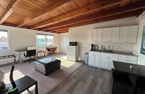 Located in a quiet neighborhood in Mission Valley, this newly renovated Studio is a dream. With a serene atmosphere and wonderful features including tableware for 4, an induction stove, mini fridge, microwave, Keurig coffee maker, and toaster oven, it offers the perfect getaway for guests. The 400 square foot upstairs unit also includes a spacious living room, large windows that provide a canyon view and breeze, queen bed, desk with chair, and table for dining. The bathroom is equipped with a hair dryer, refreshing shower, and towels. Stay connected with free WiFi and enjoy the convenience and luxury of heating and AC.