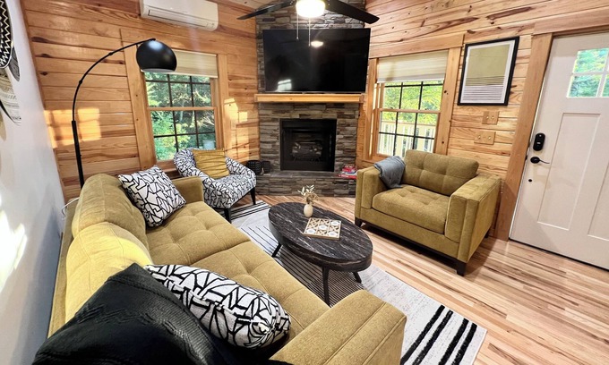 Our private 1 bedroom cabin sleeps 4 and boasts beautiful pine walls, a cozy open floor plan , large stone gas fireplace, large tiled shower, washer & dryer and a fully stocked kitchen.