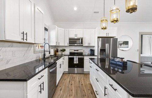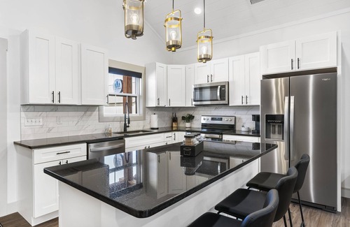 The cabin features two bedrooms and two bathrooms, accommodating up to eight guests. There are two queen-sized sleeper sofas in the living room space. The kitchen is fully equipped with all small appliances, in-door ice and water dispenser, stoneware, flatware, crock pot, baking pans, etc. The utility area with a full-size stacked washer and dryer is located in the laundry room.
