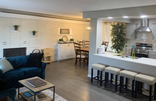 This is a ranch home with 3 bedrooms and 2 full bathrooms on 1/4 acre with a fenced backyard! There bedroom layout is 2 bedrooms with queen beds, and 1 office/bedrooms with a full sized futon. There are 2 showers in the home and a laundry room available for guests to use. Pack and play provided. Kitchen is stocked with a vitamix and kitchenaide stand mixer. The home has off street parking as well as ample street parking. There is a hang out space with a bar and fireplace! This is a brand-new remodel! The home highlights a remodeled kitchen with gray cabinets, new stainless appliances, and white quartz countertops. All bathrooms have new tile, vanities, and fixtures. New flooring, paint and windows throughout the home.