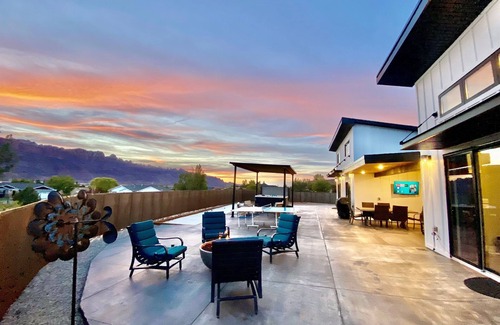 This 5-bedroom, 5-bath luxury estate was custom-built as the ultimate Moab vacation rental. With 3,500+ sq. ft. of indoor living space and 2,000 sq. ft. of outdoor living areas, the villa comfortably sleeps 16 guests—perfect for large groups, family reunions, and retreats. Enjoy a year-round private heated pool, hot tub, and fire pit while taking in the breathtaking views of the red rock desert and La Sal Mountains.