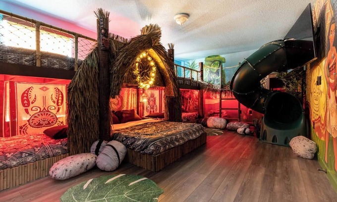 Moana-Themed Room – A custom Polynesian island treehouse with tiki hut bunk beds, murals, and a built-in slide for the kids.