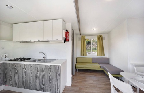 The Mobile Home includes a shared outdoor area with a garden, a playground and a furnished covered terrace where you can enjoy the view of the surroundings.