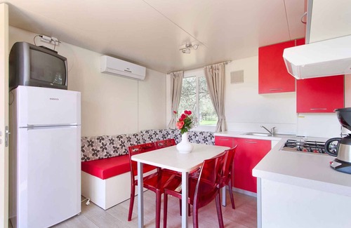 The detached mobilehome is furnished in a functional style. The property is located in a holiday resort, on the outskirts. Also due to its sunny location the domicile is popular. Available for use: terrace and garden furniture.Holiday resort207 accommodations. LocationRabac. The mobilehome is located in a holiday complex. There are Standard (4 persons), Comfort 386 (5 persons - only one child up to 9.99 years can sleep on the 5th bed) and Premium (4 persons) mobile homes in the complex. Rabac is the most important tourist centre on the east coast of the Istrian peninsula, around 40 kilometres from Pula-Pola and just five kilometres from Labin. A real insider tip among the most beautiful beaches in Rabac is Plaza Prizinja, sometimes also known as Four Elements Beach. An absolute idyll awaits you here, surrounded by beautiful nature. The object is located in the 1st zone of the campsite. Access is via a side road. Parking is available on the property. Specialair conditioning.Facilities: internet access (WLAN). TV reception takes place via satellite. PoolAll pools are available for shared use. Outdoor pool (usable from mid April to end of September, diameter 20 m, depth 0,4 m). Children's pool (diameter 7 m, depth 0,9 m). Indoor pool (usable from early September to early June, 50 m x 25 m, depth 2 m). The complex has a total of 4 outdoor pools and 2 indoor pools. The Innepools are closed in the summer. LeisureIn the complex: mini golf, tennis and table tennis. The facilities of the hotels Narcis, Hedera and Mimosa can be used by the guests of the mobile homes for a fee (for example wellness center, football, handball, basketball, diving school and entertainment). Dogsallowed, EUR 8.00/pet per day. DistancesShopping 150 m, restaurant 300 m, town center 1000 m. For a relaxing holiday, a car is not necessary. The nearest public transport stop is 2,5 km away. indoor swimming pool, doctor, pharmacy each 1000 m. thermal bath in 1100 m. cinema in 1,8 km. sauna in 200 m. discotheque in 2,1 km. bank in 25,9 km. airport in 26,7 km. railway station in 900 m. Children's playground 80 m. In summer: Adriatic Sea 500 m in Rabac (beach 500 m in Rabac featuring gravel). tennis, golf each 200 m. DivisionMobilehome, 1 floor, 3 rooms (including 2 bedrooms), 32 sqm, in total 4 beds. RoomThe entrance to your mobile home is located on the ground floor and leads over 2 steps. Bedroom with 1 double bed. Living/bedroom with 1 additional bed on couch/sofa, TV and access to the terrace (garden furniture). Cooking nook in the living & bedroom with dining area (5 seats), gas stove, electric stove, fridge (icebox), coffee machine and access to the terrace. Bedroom with 2 single beds and An extra bed for a child up to 10 years is available. 2 bathrooms each with shower, 1 washbasin and WC. BoardHalf board. 26.00 EUR per person per day (all on request),