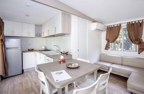 4 stars, 130 accommodations, reception (safe), 1 restaurant, pizzeria, bar, beach bar, internet (WLAN), supermarket and laundry. LocationCastiglione della Pescaia, district Rocchette. The mobilehome is located in a holiday complex, on a open garden plot with flowers and trees. Baia Azzurra Camping Village has been offering open air holidays for more than 50 years in a unique place immersed in the Mediterranean colors and scents and the sounds of nature, just 150 meters from the sea and 7 km from Castiglione della Pescaia. An excellent strategic position in the famous Rocchette district for visiting the Maremma and the art cities that surround us (Siena, Pisa, Florence, Rome). A professional team welcomes you and is at your disposal during your stay. Access is directly from the main road (asphalted). Snow chains are recommended in winter. Parking is available on the property. There is a charging station for electric cars on the property. Charging station for electric cars for a fee Specialair conditioning.Facilities: internet access (WLAN) and safe. Flat screen TVFor your safety, the accommodation is equipped with CO2 detector and fire extinguisher. The final cleaning is done by a professional company. PoolAll pools are available for shared use. Outdoor pool (usable from early April to early November, infinity-pool, diameter 20 m, depth 1,2 m). The holiday village offers its guests a large swimming pool with whirlpool, beach effect area and the new spray park with water features! Everything is surrounded by sun loungers and parasols, which are available to guests free of charge. WellnessIn the complex: whirlpool. LeisureIn the complex: gym, tennis, table tennis, table football and bike rental. Animation for children from 4 years. Adult animation. To keep fit, you can run and exercise safely and breathe clean air amidst the greenery of the pine forest in our fitness park "Area 64" with jogging path and outdoor equipment.