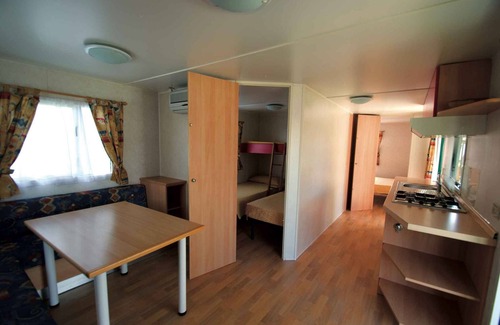 3 stars, 170 accommodations, reception (safe), 2 restaurants, pizzeria, bar, pool bar, supermarket and laundry. Playroom, LocationLido di Dante. The mobilehome is located on a campsite, on a garden plot with meadow. There are mobile homes, bungalows and pitches on the 10,000 square metre site. A separate naturist area is part of the complex. Surrounded by pine forest. Parking is available on the street in front of the house. Parking is located at the mobile home. Specialair conditioning.Facilities: children's toys. TV reception takes place via satellite.For your safety, the accommodation is equipped with CO2 detector and fire extinguisher.Hygiene measures: disinfectant and final cleaning with sanitisation. PoolAll pools are available for shared use. Outdoor pool (usable from mid May to mid September, 12 m x 25 m, depth 1,2 m). LeisureIn the complex: tennis, table tennis, table football, boccia / petanque and bike rental. Animation for children from 4 years. Adult animation. Volleyball. Tennis. Playground, beach tennis Dogsallowed, EUR 8.00/pet per day. DistancesShopping 100 m, restaurant 100 m, town center 100 m. discotheque in 15 km. bank in Lido Adriano 5 km. pharmacy in Lido di Dante 100 m. thermal bath in Punta Marina Terme 10,8 km. cinema in Ravenna 15 km. Ravenna 8 km away. Mirabilandia amusement park 8 km away. In summer: Adriatic Sea 200 m in Lido di Dante. The beach is surrounded by nature in the natural park Foce del Bevano with over 3 kilometers of beach. Through a pine forest, the beach can be reached directly from the campsite. DivisionMobilehome, 1 floor, 3 rooms (including 2 bedrooms), 28 sqm, in total 5 beds (including 1 additional bed), on request additionally 1 child up to 2 years in a baby cot. RoomThe entrance to your mobile home is at ground level and with sitting area and doors to all rooms. Living room with sitting area, TV, dining area (5 seats) and access to the terrace. Bedroom with 2 single beds and questa camera ha 2 letti singoli piani e un 3°letto rialzato a muro per bambini fino a 12 anni. Bedroom with 1 double bed. Kitchenette in the living room (walk-through room) with dining area (5 seats), gas stove (4 flames), fridge (icebox) and coffee machine. Bathroom with shower, 1 washbasin, WC and window. Credit cardsVisa, MasterCard. Terms of lease and pricesIncluded in the pricesunloungers at the pool (26.03.26-29.07.26, 30.08.26-03.10.26), parking place, tv, electricity, gas, water, local tax (under 14 years), Wireless Internet access. Side costs-Costs on the spot:/Obligatory:final cleaning 40 € per object per stay. local tax by local tariff (if charged).On request:baby cot 4 € per bed per day. air conditioning 8 € per object per day. sunloungers at the pool 5 € per piece per day (30.07.26-29.08.26), safe 3 € per object per day. bed linen 10 € per person per first time use and changing. hand towels 5 € per person per first time use and changing. parking place (additionally) 10 € per car per day. high chair - please order at booking 3 € per piece per day.Deposit:EUR 50,-/object.