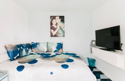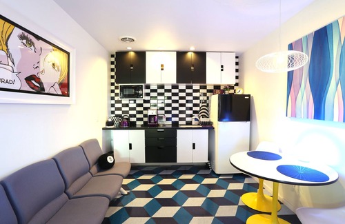 Step into a bright and boldly decorated pad, where every inch feels like an art installation dedicated to 1960s pop art. There's a large shaded balcony with a trio of sky lights that's perfect for watching sunsets or simply admiring the view of the park.