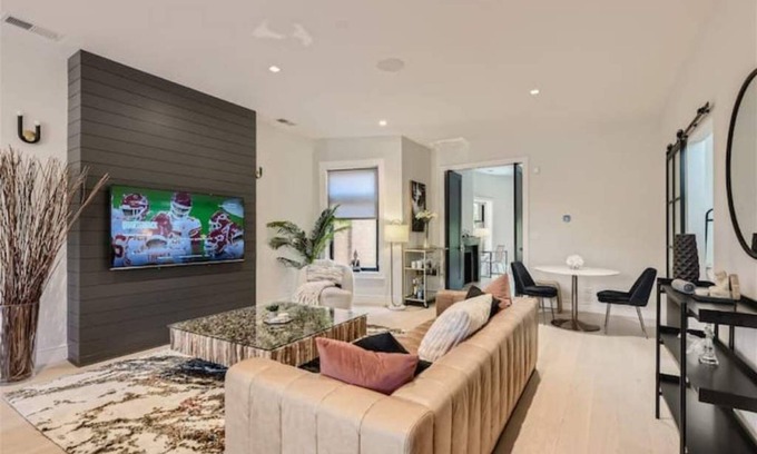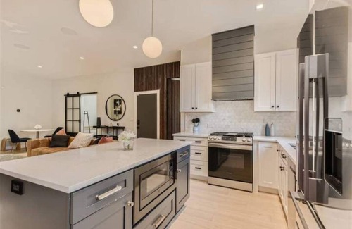 The kitchen is fully equipped with high-end appliances and supplies to make your stay just like home. The living room features an open layout with comfortable couch, 65 inch HD TV with Netflix, HBO, Hulu and more.
