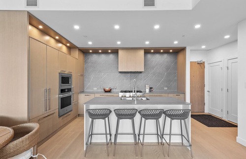 A fully equipped kitchen with quartz countertops, high end stainless steel appliances, and a breakfast island