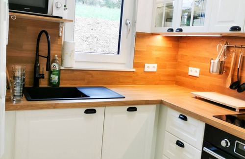 The newly built 2 room apartment has direct access to meadows and fields. It has a fully equipped kitchen including a coffee machine, microwave, dishwasher and much more.