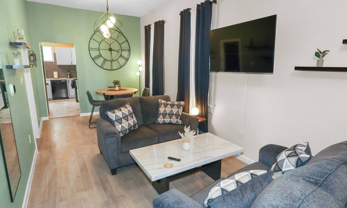 When you enter the space, you are immediately met with an inviting, open floor plan and modern, bright finishes. With a comfortable sofa and an HDTV, you will be able to easily unwind, kick back, and relax after a full day of travel.