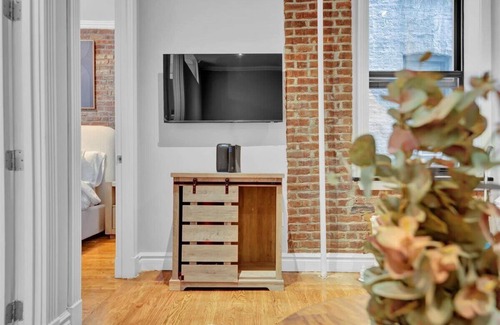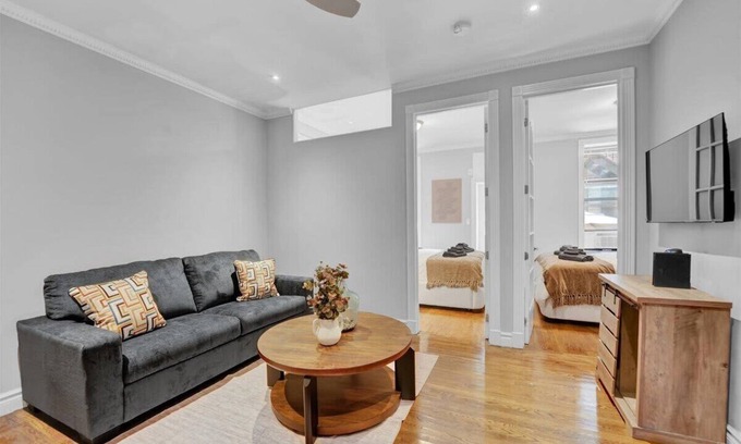 Newly renovated 2BR designer apartment in a prime East Village location featuring a private outdoor garden, stylish interiors, 1,000 Mbps internet, washer/dryer, and wine fridge. Ideal for work trips, families, or longer stays.