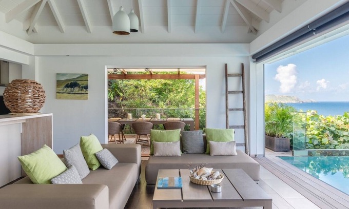 Ideally located at Pointe Milou, this charming villaoffers a spectacular view over the ocean, the bay of Lorient, and the surrounding islands. Breathe in the relaxing atmosphere and enjoy the breezes that lift the surrounding foliage. This home is the perfect place for enjoying the unforgettable sunsets of St-Barths. Whenever you wish to enjoy a meal outside, you will find yourselves very close to the restaurants of the 5-star hotel Le CHRISTOPHER.