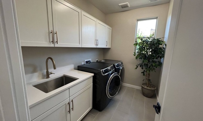 This beautiful home away from home comes with everything you need! Full kitchen, full-sized washer and dryer, and security system with cameras. Enjoy your stay just 5 miles from Banner Casa Grande! This unit is perfect for the traveling professional, or someone looking for furnished corporate housing.