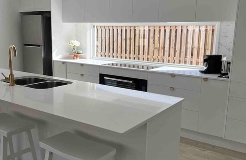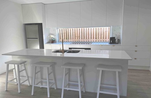 The kitchen has a minimalist design with clean lines, sleek surfaces and a large island bench, which serves as a central gathering place for family and guests.