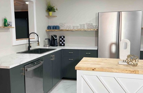 Kitchen → A fully stocked chef’s kitchen makes cooking simple, whether you’re preparing a full meal or just brewing coffee. Stainless steel appliances, ample counter space, and a modern island keep things functional and stylish. A coffee bar with Keurig and drip options (pods and grounds supplied) is ready to fuel your mornings.