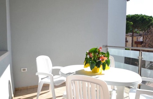 Beautiful, recently built first-floor apartment for up to 5 guests, 500m from the beach and 50m from the center (Viale dei Pini). It features a living room with kitchenette and sofa bed, 1 double bedroom, 1 bedroom with bunk beds, 1 bathroom with shower, 2 large terraces with outdoor furniture, TV-sat, free Wi-Fi, washing machine, A/C, mosquito nets, and microwave. Uncovered parking space included.