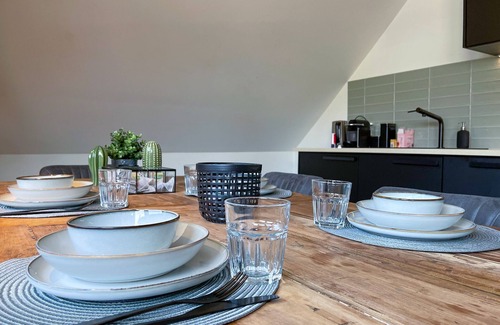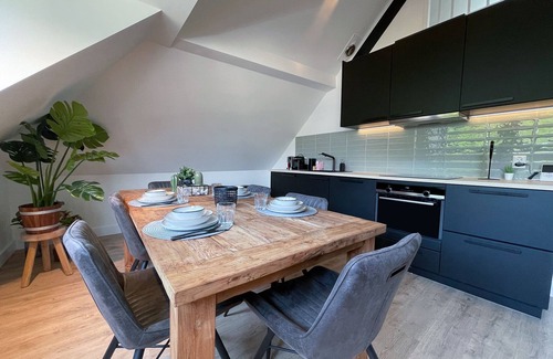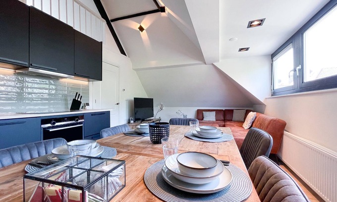 The apartment has a large open and bright living room with a authentic ceiling with beautiful black wooden beams. The living room is also equipped with a cozy couch, large 65inch TV and a beautiful big dining table. The master bedroom has a comfortable double bed, and a large wardrobe. The 2nd bedroom is located in the attic, it has a comfortable single bed. The third bedroom also has a double bed and a wardrobe, this bedroom is almost as big as the master bedroom. The stylish open kitchen is located in the living room and is fully equipped with crockery, cutlery, pans, a Nespresso coffee machine, dishwasher, toaster, oven / microwave, and kettle. The modern apartment is fully equipped to meet all your needs.