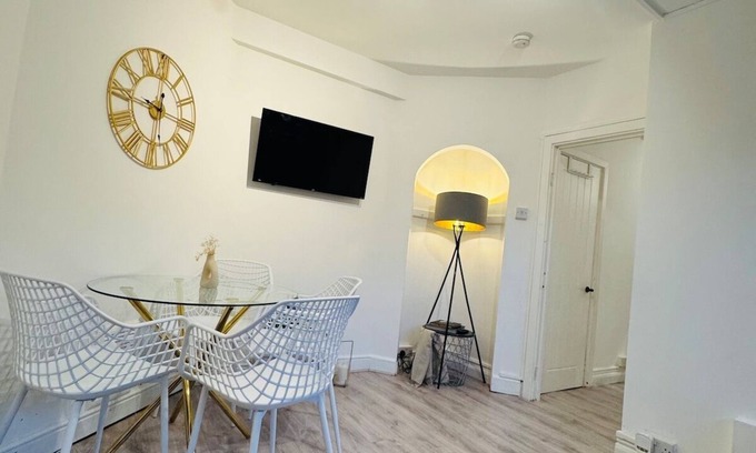 - Living Area: A bright and spacious living room with a flat-screen TV, comfortable sofa, and dining table. Ideal for relaxing after a long day exploring London.