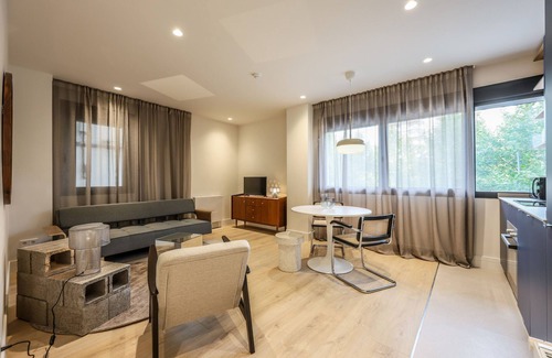 The space has a living-dining room area with a comfortable single sofa bed where one person can sleep perfectly. Decorated with designer furniture and the best qualities, it has a Smart TV, high-speed Internet and a comfortable round dining table.
