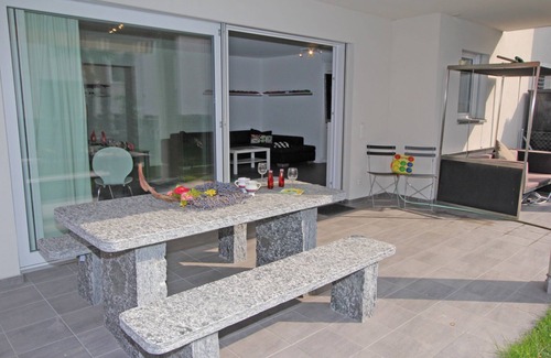 The apartment on ground floor has its own garden with lying area and a spacious, covered terrace with granite stone table, seating area and sun blinds. Driveway until house. Reserved parking space in garage. Bus stop, shops about 300m. The Maggia River with bathing facilities (rock, stone, gravel) is just about 800m and the beautiful beach in Ascona about 2,5 km away. The two very nice and challenging 18-hole golf courses Ascona and Losone are only about 2,5 km away. Bed/kitchen linen available. Washing machine and dryer for private use. Pets permitted.