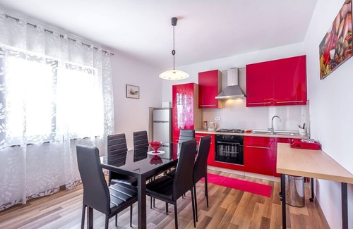 We present you this flat in Pula in a private house located on a fenced plot. This large flat on the ground floor is suitable for eight people. This apartment house with a well-kept garden is located only a few kilometres from the beach and is very close to the city centre.