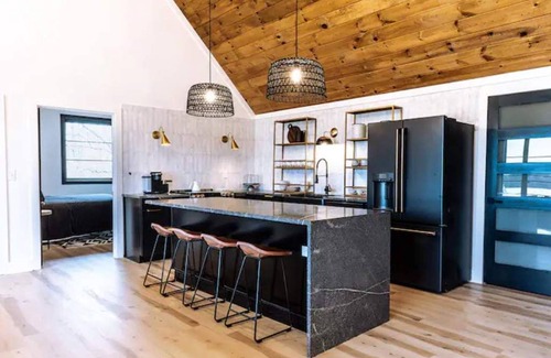One-of-a-kind Kentucky barn home nestled on 43 rolling acres. The modern design of this black barn is restful and sophisticated. Wake up and enjoy your coffee overlooking the pastures with all the modern amenities one would expect—2 King beds, 2 twins, 1 Bath with soaking tub and double walk in rain shower, full kitchen, & laundry. Enjoy beautiful morning walks to the chicken coop for fresh eggs for breakfast and a late afternoon soak in the hot tub or a cozy fireside conversation.