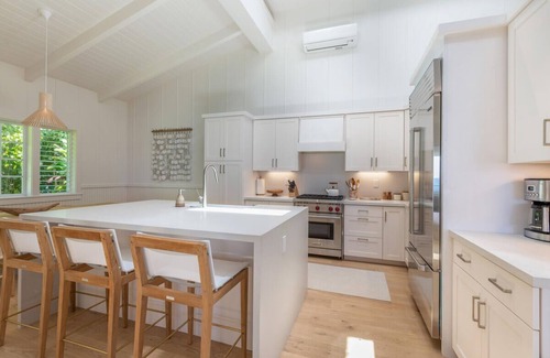 Haena Modern Beachfront, Hale Elua (Two) is a newly renovated modern beach home with luxurious furnishings. Hale Elua offers 3 bedrooms, 2.5 bathrooms, a fully equipped gourmet kitchen, a formal dining room table, casual outdoor dining on the lanai, air conditioning, high-speed internet & hot tub. There are two homes on the property that are available to rent individually and experience a beautiful private escape for your oceanside adventure or you may want to rent them both for a family reunion, small business conference, or group of friends.