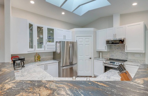 The modern kitchen, with a breakfast space and a bar, is fully stocked with everything you need for home-cooked meals. This space makes for a welcoming spot to gather for a cup of coffee or a glass of wine while cooking your meal together. The adjacent dining room, with an expandable table that can seat up to 10 people, making it a great area for larger meals and get-togethers.