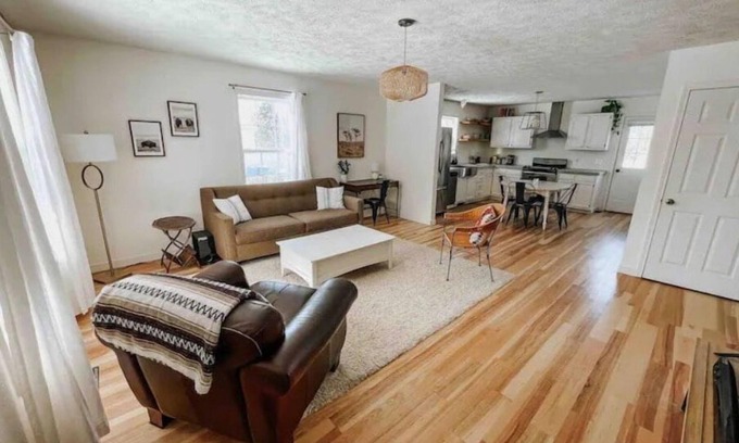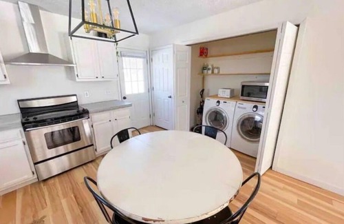 Enjoy the luxury of a rainfall overhead in the spacious walk-in shower. A large smart TV provides entertainment while your dinner bakes in the oven of the electric stove in the fully appointed kitchen or your laundry gets done in the free on-site washer and dryer. A desk and free WiFi are conveniently included if you need to get work done. You’ll also enjoy central A/C and heating in the home during your stay. There’s also a large, shared backyard with a privacy fence and a hot tub right outside the back door if you need some space to unwind. Hot beverage options abound with an electric drip coffee maker, a pour-over coffee maker, and an electric hot water kettle. A full-size refrigerator, microwave, and toaster complete your kitchen needs. You will have use of a one-car garage to secure your vehicle and keep it out of the elements. The garage is also attached, so you will be protected from any rain or snowfall as well.