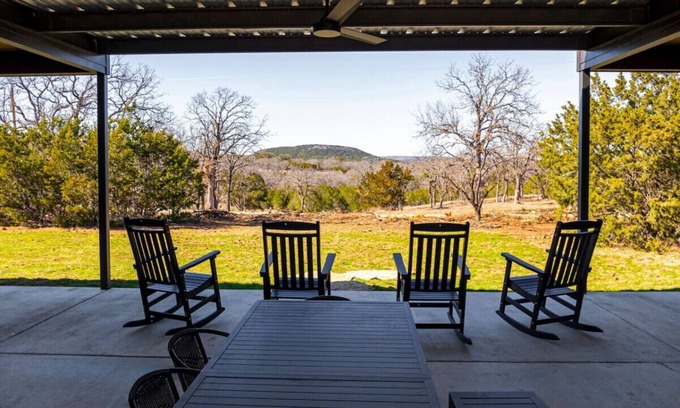 Come and experience the tranquility and natural beauty of this modern cabin, where every detail has been thoughtfully curated to provide a memorable escape for your family or group in the heart of the north Texas hill country. The shared covered patio frames big bear mountain - our private mountain with hiking trails. 3 separate cabins that sleep up to 7 each. Only 1.5 hours from DFW! Set up with starlink and work stations for those needing to do a little remote work while the others play.