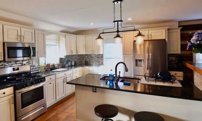 This cozy home accommodates up to 7 people, featuring three bedrooms and two full bathrooms. Experience the seamless flow of open-concept living, where the living room, dining room, and kitchen harmoniously merge. The kitchen boasts a gas range, coffee maker, and all essential utensils. Step outside to a spacious deck and a picturesque backyard, perfect for unwinding.