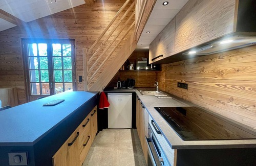New atypical semi-detached chalet, ideal for 4 people. Located halfway between Crest-Voland and Cernix, you will love its west terrace offering a superb view of the mountains. With a surface area of approximately 30sqm on two floors, it offers quality services. Please note, it is not suitable for young children and people with reduced mobility because the ceiling height is low for access to the mezzanine bedroom (see photos).