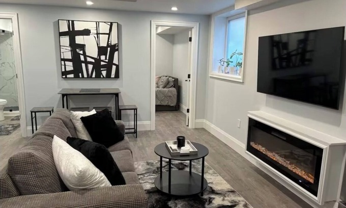 *This property has a no party, no outside visitor policy. Whether you need a romantic getaway, a place for work, or quality time with your family, this clean bright modern private unit has it all. This apartment is located in the look out basement of the house. There are stairs to get down to the unit. A large bay window in the family room lets in a lot of natural light. Cozy up on the couch in front of the fireplace and enjoy a movie on the 55inch Samsung smart TV.