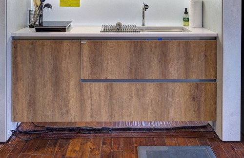 The space is open to the kitchen and living which makes it awesome to access and see everything. Reminds me of a loft space.