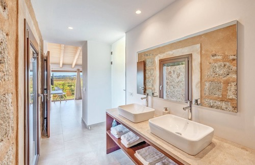 The Finca "Can Tano" is situated in the heart of the popular Balearic island Mallorca, only a few kilometres away from the village Inca. Situated on a 15.000 m² property, surrounded by wide fields and with its own winery, this newly renovated property combines modern simplicity with traditional Majorcan architecture. With 550 m² of living space, the two-storey finca consists of a living room with a large couch landscape, a modern, very well-equipped kitchen with a cooking island, 6 bedrooms (each with 2 single beds), 6 bathrooms as well as an additional toilet and can therefore accommodate 12 people. Amenities also include Wi-Fi, air conditioning, underfloor heating, satellite TV, a baby cot and a high chair. A real oasis of well-being awaits you outside too. On a covered terrace you will find a dining area for 12 people and comfortable lounge furniture with a view of the garden and pool area. Swim in the 50 m² saltwater pool, refresh yourself in the outdoor showers or read a good book on the comfortably upholstered sun loungers. Once you glance at the meadows, fields and mountains, the stress of everyday life is quickly forgotten. Despite the idyllic location you can reach supermarkets, restaurants, bars and cafés after only 4.5 km or a 7-minute drive and the beautiful beaches of the eastern coast, such as Platja de Muro, are about 30 km or a 30-minute drive from the accommodation.