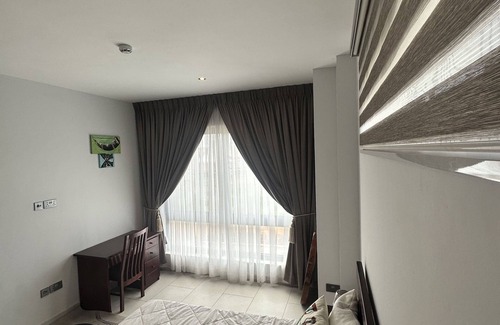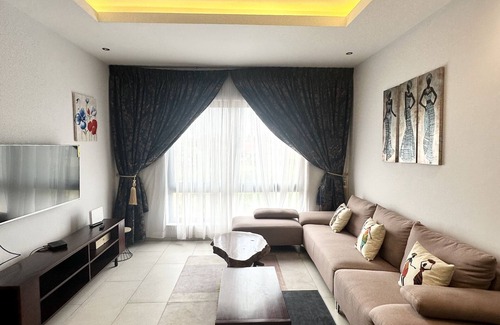 Akwaaba! Modern and cozy 1 bedroom 1.5 bathroom apartment in a newly constructed apartment complex. Fully furnished with wifi, AC's in each room and fully equipped kitchen. Quiet apartment complex, Conveniently located near the airport, restaurants, nightlife & activities. 24/7 gated security and an elevator on site.