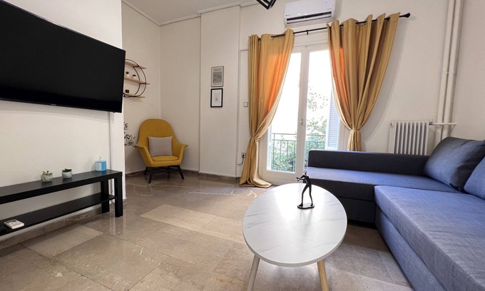 Our apartment is located 5' from Thisseio metro station and 13' on foot from the Acropolis. Explore the impressive Aeropagitou pedestrian street, filled with neoclassical buildings, cafes, and street vendors, and get immersed in one of the most charming Athenian districts, Thisseio! Our apartment is ideal for families, couples, or friends who prefer a quiet and relaxing apartment with everything you might need for a pleasant stay. The flat can comfortably accommodate up to 4 guests. The apartment is 51m² on the ground floor although you need to get up 7 stairs before accessing it. It consists of one spacious bedroom, living room with a 50" smart TV, a cozy kitchen with all necessary supplies, a bar and a washing machine, a bathroom with shower, and a narrow balcony overlooking a quiet backyard garden. The bedroom has a double bed (160*200cm) equipped with a brand-new mattress to ensure a pleasant night's sleep. Two more people can sleep on the sofa which can be converted to a comfortable double bed (140*200cm). There is central heating for the winter months and the rooms are ACed all year round. One unit in the living room and one in the bedroom.
