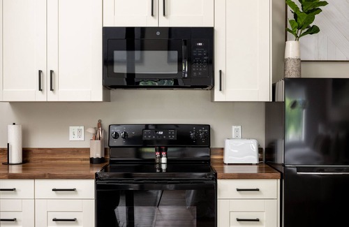 The kitchen comes fully loaded with all amenities for both short and long-term stays. Enjoy the convenience of a washer and dryer, an ironing board, and large closets for all your belongings.