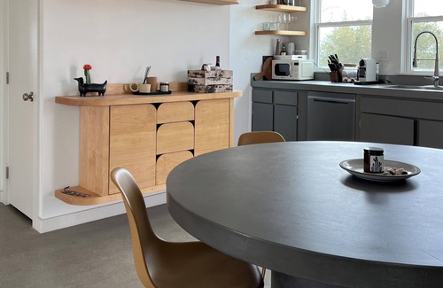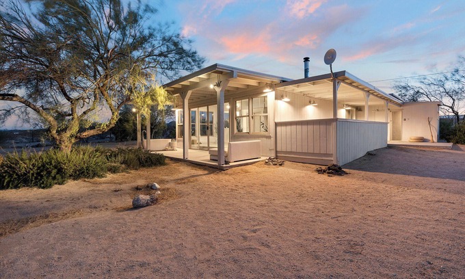 The Cabin on Five Moon Ranch is a serene desert retreat with 360° views. The perfect getaway, with all the creature comforts including stylish furnishings, comfy organic mattress, and luxurious amenities. We all love stargazing from the bed! Our cabin is a "penthouse on the sand", one returning guest declared. We've created a casual, creative space in nature to refresh and unwind from city life. Surrounded by rose quartz crystal beds, the property itself has a magical energy. We have surrounded the exterior with found crystals that serve as protection. The cabin is equipped with an outdoor bathtub for soaking under the stars and a rejuvenating steam shower for desert re-hydration and max relaxation. The cabin is on 5 acres, surrounded by public land, a secluded sanctuary of creosote, crystal beds, and dark, clear skies. Enjoy the outdoors or immerse yourself in creative pursuits in and around our property. Our detached office has a printer and a computer monitor, perfect for a podcast or video conference. Chillax with a film on the Frame Smart TV. Spin vinyl on the record player. Enjoy some literature from our extensive library. The stocked kitchen has appliances and cookbooks for any culinary endeavor. There are boulders to hike and explore just a 10-minute walk away, and a hike with petroglyphs 2 miles away. The famed Integretron, where you can book a soundbath, is a 10-minute drive from the cabin. On your way, grab an amazing brunch at La Copine Kitchen. The amazing Joshua Tree National Park is just 30 minutes away. Yucca Valley, Joshua Tree & Pioneer Town are nearby if you're looking for music, art, dining & outdoor activities. We are 45 minutes from Palm Springs and Coachella Valley - perfect for flying in and out and recovering from the festivals.