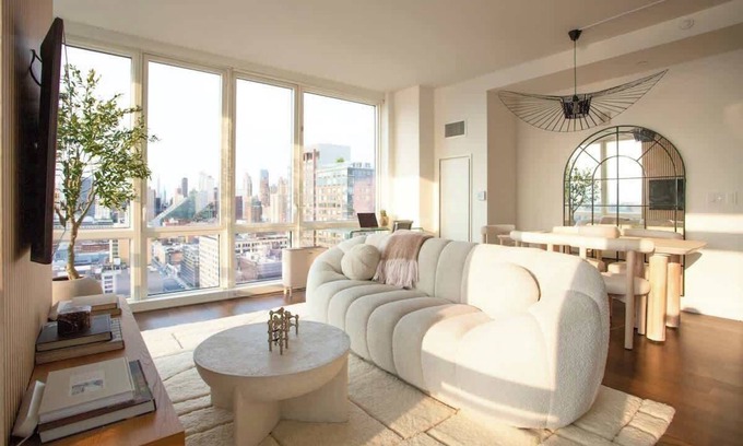 Relax to a thoughtfully designed apartment in a luxury high-rise, boasting stunning Hudson River and NYC skyline views. Every detail is curated by your host, whose work has been featured in Vogue and Architectural Digest, ensuring a unique blend of comfort, style, and convenience. The furnishings, including pieces from high-end stores to create a refined ambiance perfect for discerning travelers and remote workers.
