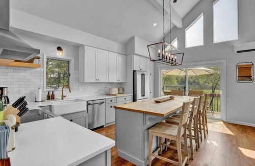 Home includes a modern kitchen with Cafe Appliance electric stovetop, oven, dishwasher, and fridge. We also include all the plates, utensils, pots, and pans you’ll need to eat a family meal at our huge eat-in island or picnic outside!