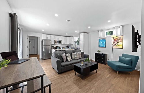 Stay in a modern and stylish retreat perfectly located in the heart of Louisville. Ideal for remote-working professionals during the week and groups visiting for Derby, Bourbon & Beyond, or Forecastle on weekends. Walk to breweries, bourbon tours, coffee shops, and restaurants. With smart lock entry, high-speed Wi-Fi, a quiet desk nook, spacious living area, fully stocked kitchen, and flexible sleeping, this home blends comfort, and convenience!
